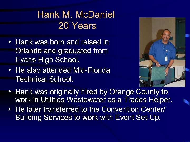 Hank M. Mc. Daniel 20 Years • Hank was born and raised in Orlando and graduated from Evans High School. • He also attended Mid-Florida Technical School. • Hank was originally hired by Orange County to work in Utilities Wastewater as a Trades Helper. • He later transferred to the Convention Center/ Building Services to work with Event Set-Up.