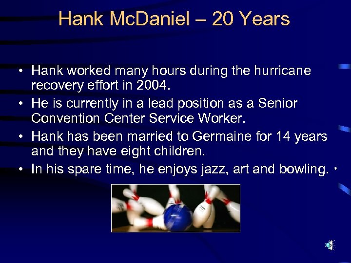 Hank Mc. Daniel – 20 Years • Hank worked many hours during the hurricane recovery effort in 2004. • He is currently in a lead position as a Senior Convention Center Service Worker. • Hank has been married to Germaine for 14 years and they have eight children. • In his spare time, he enjoys jazz, art and bowling. *