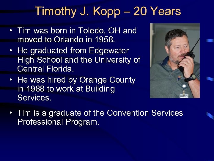 Timothy J. Kopp – 20 Years • Tim was born in Toledo, OH and moved to Orlando in 1958. • He graduated from Edgewater High School and the University of Central Florida. • He was hired by Orange County in 1988 to work at Building Services. • Tim is a graduate of the Convention Services Professional Program.