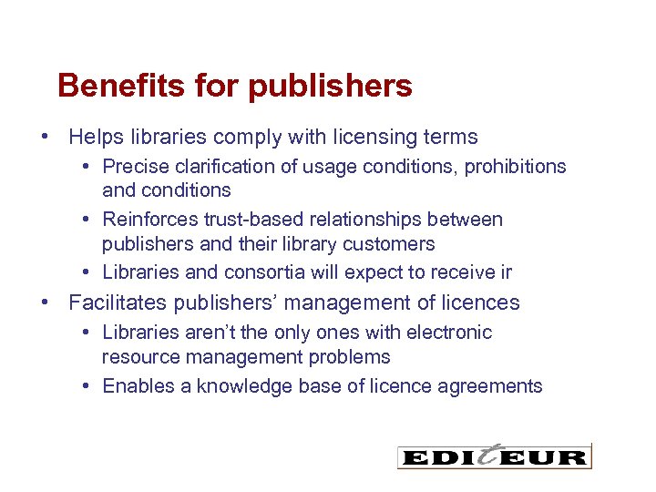 Benefits for publishers • Helps libraries comply with licensing terms • Precise clarification of usage conditions, prohibitions and conditions • Reinforces trust-based relationships between publishers and their library customers • Libraries and consortia will expect to receive ir • Facilitates publishers’ management of licences • Libraries aren’t the only ones with electronic resource management problems • Enables a knowledge base of licence agreements