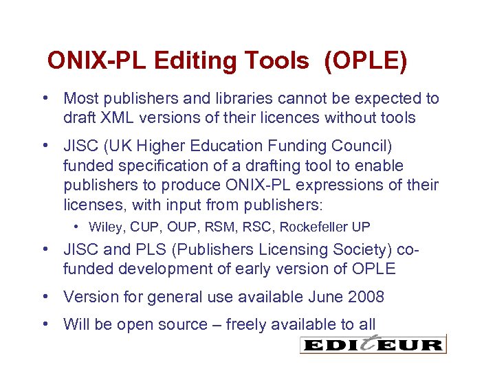 ONIX-PL Editing Tools (OPLE) • Most publishers and libraries cannot be expected to draft XML versions of their licences without tools • JISC (UK Higher Education Funding Council) funded specification of a drafting tool to enable publishers to produce ONIX-PL expressions of their licenses, with input from publishers: • Wiley, CUP, OUP, RSM, RSC, Rockefeller UP • JISC and PLS (Publishers Licensing Society) cofunded development of early version of OPLE • Version for general use available June 2008 • Will be open source – freely available to all