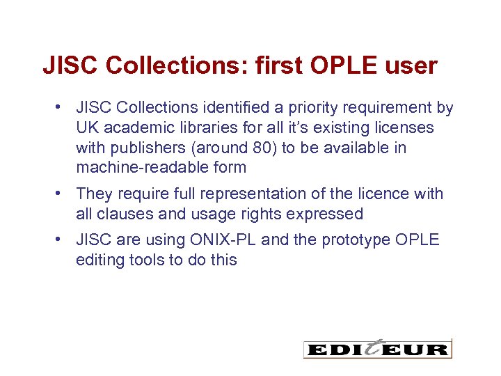 JISC Collections: first OPLE user • JISC Collections identified a priority requirement by UK academic libraries for all it’s existing licenses with publishers (around 80) to be available in machine-readable form • They require full representation of the licence with all clauses and usage rights expressed • JISC are using ONIX-PL and the prototype OPLE editing tools to do this