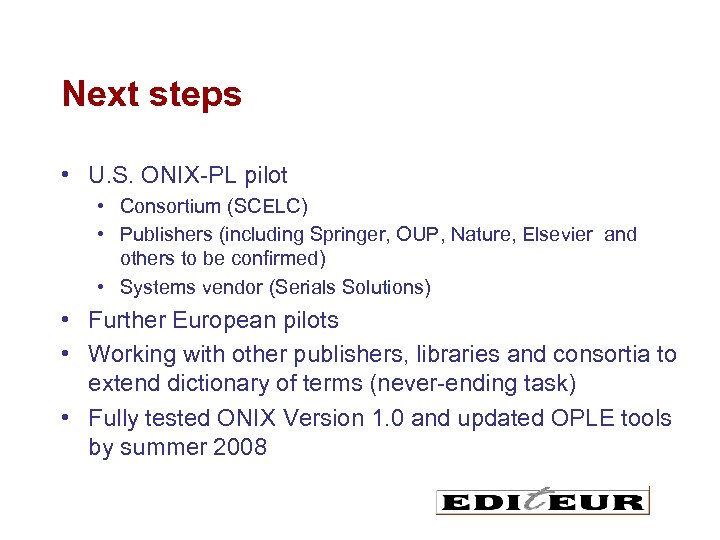 Next steps • U. S. ONIX-PL pilot • Consortium (SCELC) • Publishers (including Springer, OUP, Nature, Elsevier and others to be confirmed) • Systems vendor (Serials Solutions) • Further European pilots • Working with other publishers, libraries and consortia to extend dictionary of terms (never-ending task) • Fully tested ONIX Version 1. 0 and updated OPLE tools by summer 2008