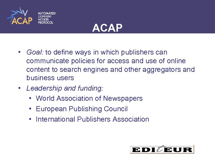 ACAP • Goal: to define ways in which publishers can communicate policies for access and use of online content to search engines and other aggregators and business users • Leadership and funding: • World Association of Newspapers • European Publishing Council • International Publishers Association