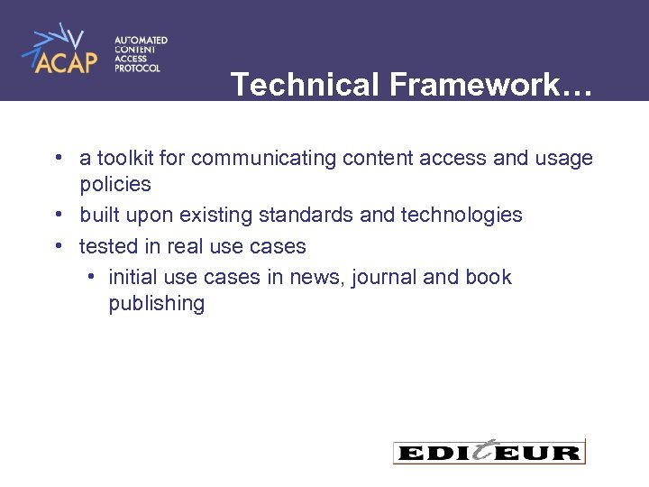 Technical Framework… • a toolkit for communicating content access and usage policies • built upon existing standards and technologies • tested in real use cases • initial use cases in news, journal and book publishing