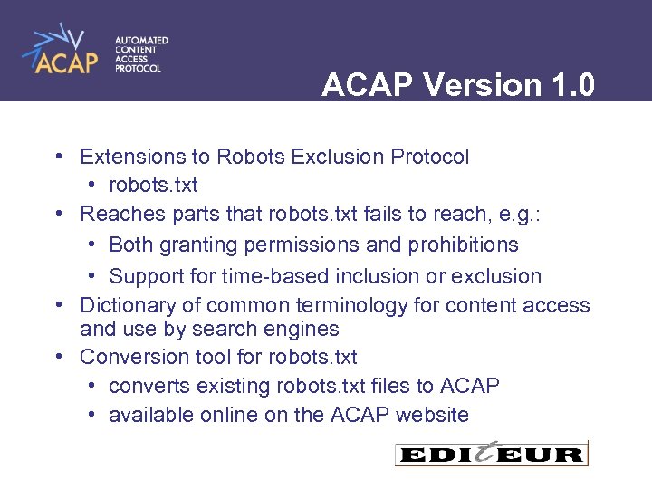 ACAP Version 1. 0 • Extensions to Robots Exclusion Protocol • robots. txt • Reaches parts that robots. txt fails to reach, e. g. : • Both granting permissions and prohibitions • Support for time-based inclusion or exclusion • Dictionary of common terminology for content access and use by search engines • Conversion tool for robots. txt • converts existing robots. txt files to ACAP • available online on the ACAP website
