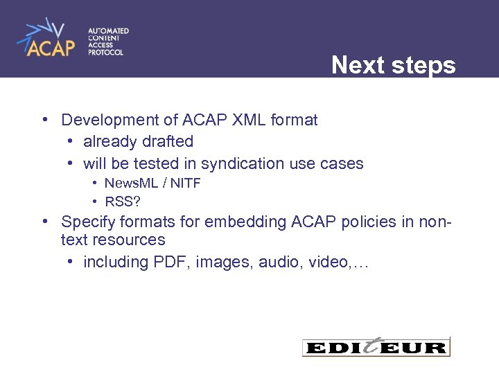 Next steps • Development of ACAP XML format • already drafted • will be tested in syndication use cases • News. ML / NITF • RSS? • Specify formats for embedding ACAP policies in nontext resources • including PDF, images, audio, video, …