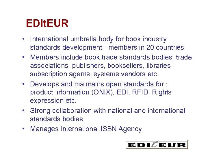 EDIt. EUR • International umbrella body for book industry standards development - members in 20 countries • Members include book trade standards bodies, trade associations, publishers, booksellers, libraries subscription agents, systems vendors etc. • Develops and maintains open standards for : product information (ONIX), EDI, RFID, Rights expression etc. • Strong collaboration with national and international standards bodies • Manages International ISBN Agency