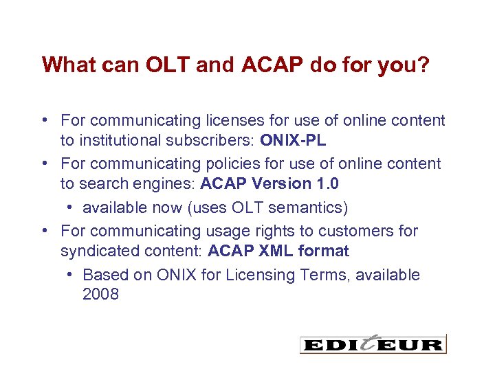 What can OLT and ACAP do for you? • For communicating licenses for use of online content to institutional subscribers: ONIX-PL • For communicating policies for use of online content to search engines: ACAP Version 1. 0 • available now (uses OLT semantics) • For communicating usage rights to customers for syndicated content: ACAP XML format • Based on ONIX for Licensing Terms, available 2008