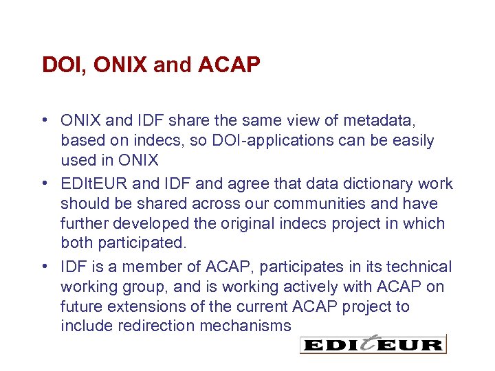 DOI, ONIX and ACAP • ONIX and IDF share the same view of metadata, based on indecs, so DOI-applications can be easily used in ONIX • EDIt. EUR and IDF and agree that data dictionary work should be shared across our communities and have further developed the original indecs project in which both participated. • IDF is a member of ACAP, participates in its technical working group, and is working actively with ACAP on future extensions of the current ACAP project to include redirection mechanisms