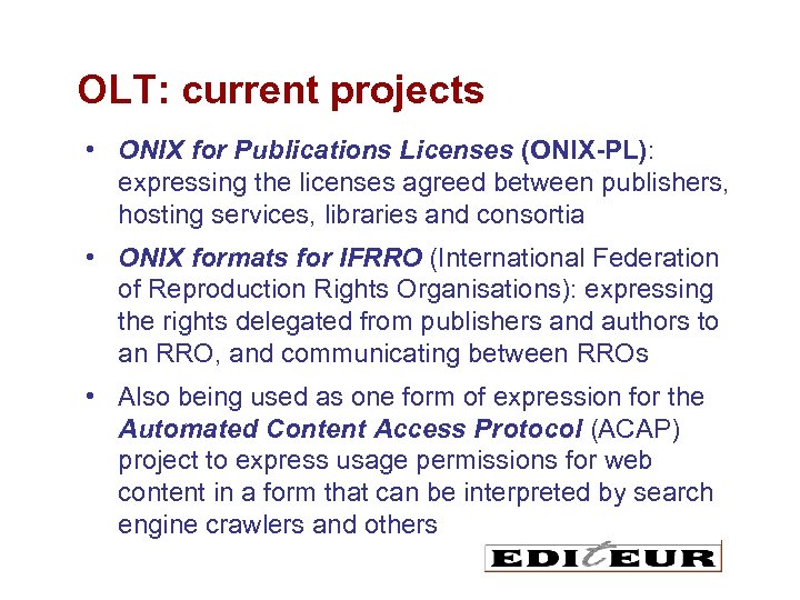 OLT: current projects • ONIX for Publications Licenses (ONIX-PL): expressing the licenses agreed between publishers, hosting services, libraries and consortia • ONIX formats for IFRRO (International Federation of Reproduction Rights Organisations): expressing the rights delegated from publishers and authors to an RRO, and communicating between RROs • Also being used as one form of expression for the Automated Content Access Protocol (ACAP) project to express usage permissions for web content in a form that can be interpreted by search engine crawlers and others