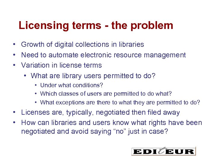 Licensing terms - the problem • Growth of digital collections in libraries • Need to automate electronic resource management • Variation in license terms • What are library users permitted to do? • Under what conditions? • Which classes of users are permitted to do what? • What exceptions are there to what they are permitted to do? • Licenses are, typically, negotiated then filed away • How can libraries and users know what rights have been negotiated and avoid saying “no” just in case?