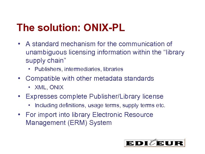 The solution: ONIX-PL • A standard mechanism for the communication of unambiguous licensing information within the “library supply chain” • Publishers, intermediaries, libraries • Compatible with other metadata standards • XML, ONIX • Expresses complete Publisher/Library license • Including definitions, usage terms, supply terms etc. • For import into library Electronic Resource Management (ERM) System