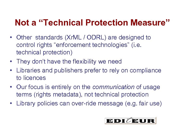 Not a “Technical Protection Measure” • Other standards (Xr. ML / ODRL) are designed to control rights “enforcement technologies” (i. e. technical protection) • They don’t have the flexibility we need • Libraries and publishers prefer to rely on compliance to licences • Our focus is entirely on the communication of usage terms (rights metadata), not technical protection • Library policies can over-ride message (e. g. fair use)
