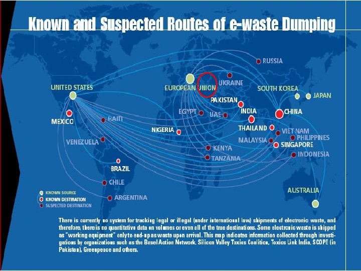 The legacy of 20 years E-waste recycling E/SE-Asia E-waste recycling with primitive techniques resulted in polluted megasites containing large pollution reservoirs: heavy metals, POPs (PBDEs, PCBs), unintentional POPs (Dioxins, PAHs) E-waste mountains E/SE-Asia E-waste recycling ashes at river bank in China