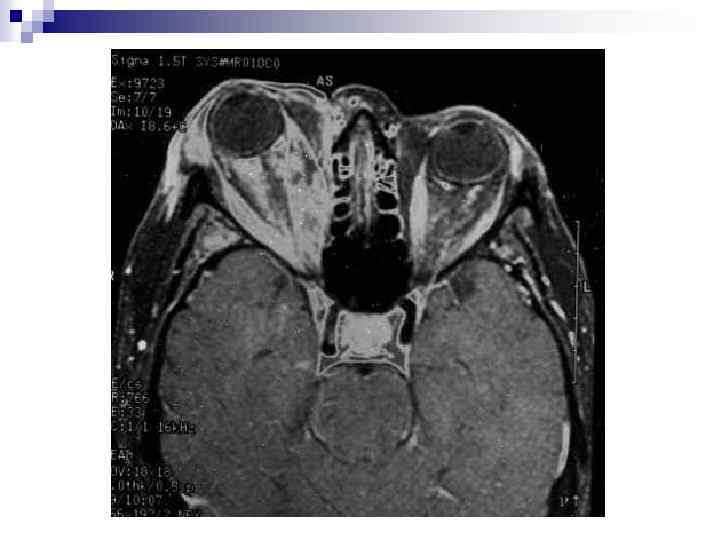 Эндокринная миопатия • • • Двусторонний процесс На фоне гипотиреоза или эутиреоза Чаще у мужчин Диплопия, ограничение подвижности глаза Экзофтальм с затрудненной репозицией Морфологически: • • утолщение и уплотнение одной или двух наружных мышц Короткая стадия клеточной инфильтрации, через несколько месяцев – фиброз Эндокринология: национальное руководство / под ред. Дедова И. И. , Мельниченко Г. А.