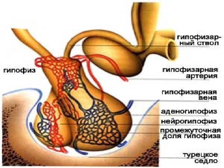 . Гипофиз ГИПОФИЗ, или нижний мозговой придаток, эндокринная железа, расположенная в костном кармане (турецком седле) у основания мозга. У человека он величиной с горошину и весит около 0, 5 г. • Гипофиз состоит из трех долей: передней, промежуточной и задней. Первые две доли состоят из железистой ткани и образуются у эмбриона из кармана Ратке – переднего выпячивания кишечной трубки. Заднюю долю образует вырост нервной ткани, идущий от дна промежуточного мозга. Все эти доли фактически являются отдельными железами, и каждая секретирует свои собственные гормоны. Передняя доля гипофиза вырабатывает белковые гормоны, шесть из которых выделены в химически чистом виде. Их строение в настоящее время полностью расшифровано. Точное число секретируемых передней долей гормонов не установлено, ниже рассматриваются лишь хорошо известные. Промежуточная доля гипофиза секретирует меланоцит-стимулирующий гормон (МСГ, интермедин), который увеличивает размеры некоторых пигментных клеток в коже низших позвоночных. Например, лишенные этого гормона головастики из-за сокращения (сжатия) пигментных клеток приобретают серебристый цвет. МСГ образуется из той же молекулы-предшественника, что и адренокортикотропный гормон (АКТГ). В передней доле гипофиза этот предшественник превращается в АКТГ, а в промежуточной – в МСГ вырабатывается и в гипофизе млекопитающих, но его функция остается неясной. Задняя доля гипофиза содержит два гормона, причем оба вырабатываются в гипоталамусе, а оттуда поступают в гипофиз. Один из них, окситоцин, – наиболее активный из присутствующих в организме факторов, вызывающий такие же сильные сокращения матки, как при родах. Этот гормон иногда применяют в акушерстве для стимуляции затянувшихся родов, но значение его нормальных концентраций в родовой деятельности не установлено. Окситоцин вызывает также сокращения мышечных стенок желчного пузыря, кишечника, мочеточников и мочевого пузыря. Второй гормон, вазопрессин, при введении в организм вызывает многочисленные эффекты, в том числе повышение кровяного давления вследствие сужения сосудов и уменьшение диуреза (выведения мочи). Однако в нормальных условиях он оказывает в организме лишь одно известное действие – регулирует количество воды, выделяющееся через почки. Даже под влиянием чрезвычайно малых его концентраций вода, профильтровавшаяся в почечных клубочках, всасывается обратно в почечных канальцах (реабсорбируется), и образуется концентрированная моча. При разрушении задней доли гипофиза опухолями или другими патологическими процессами развивается состояние, называемое несахарным диабетом. При этом заболевании организм теряет через почки огромное количество воды, превышающее иногда 38 л в сутки. Возникает сильная жажда, и чтобы избежать обезвоживания, больным приходится потреблять соответствующее количество воды.