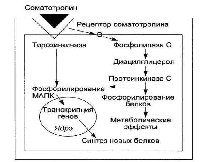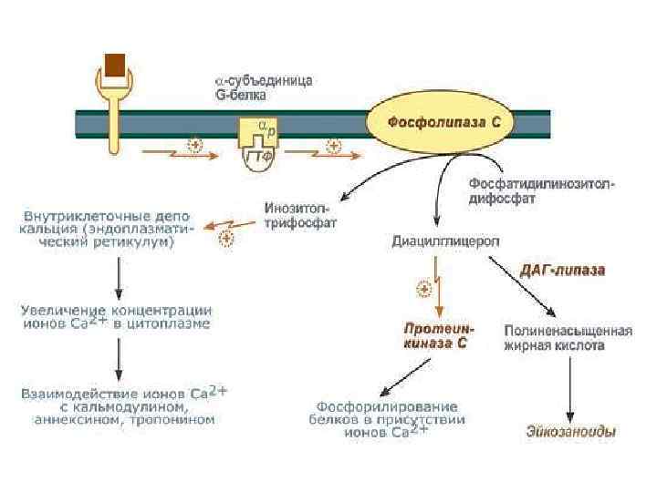 гормоны Мембранные рецепторы G-белки Gs Фосфолипаза С ц. АМФ АТФ Аденилат циклаза G G Диацилглицерол Gi ПРОТЕИНКИНАЗЫ ВНУТРИКЛЕТОЧНЫЕ БЕЛКИ Инозитол Три фосфат Са