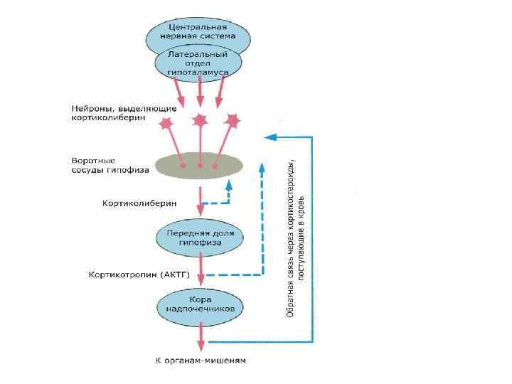 Гипоталамус Адено-гипофиз Органы (регуляторные мишени гормоны) Кортиколиберин Кортикотропин (АКТГ) Кора надпочечников Тиро-либерин Тиротропин (ТТГ) Щитовидная железа Гонадолиберин Гонады (половые Гонадотропины: Лютропин Фоллитропин железы)