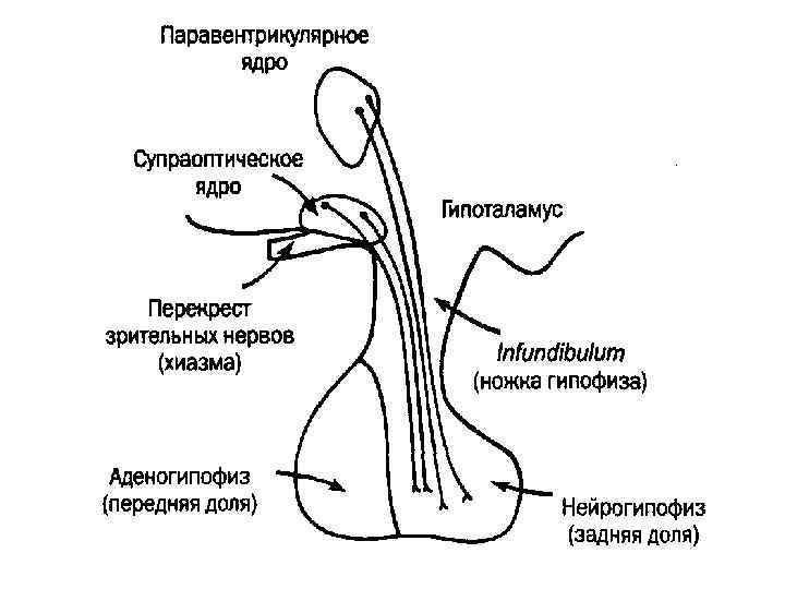 Гипоталамус Аденогипофиз Органы мишени Соматолиберин Соматостатин Соматотропин (гормон роста) Печень, кости и другие органы Пролактолиберин (тиролиберин) Пролактин Молочная железа Меланолиберин ? Меланотропин Меланоциты кожи
