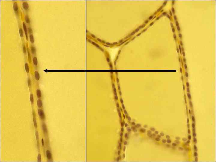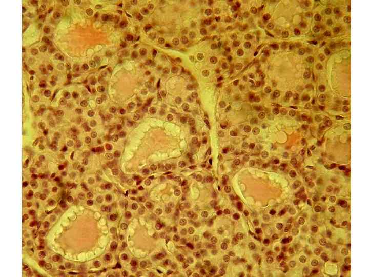 Основная часть железистых клеток щитовидной железы образует многочисленные фолликулы, заполненные гомогенным коллоидом. Небольшая часть железистых клеток формирует компактные скопления вне фолликулов - т. н. экстрафолликулярный эпителий. NB! некоторые из таких "экстрафолликулярных скоплений" железистого эпителия могут на самом деле принадлежать фолликулам, срезанным вдоль их стенки.