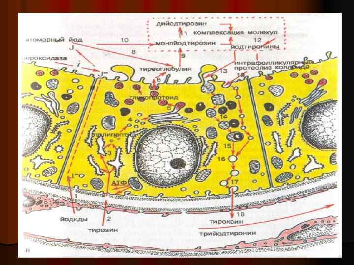 ЩИТОВИДНАЯ ЖЕЛЕЗА Окраска гематоксилин-эозином l l l l 1 –Соединительно тканная капсула 2 – долька 3. Междольковая соединительная ткань 4. кровеносный сосуд 5. фолликул 6. коллоид 7. Вакуоли в коллоиде 8. Межфолликуляр ные островки