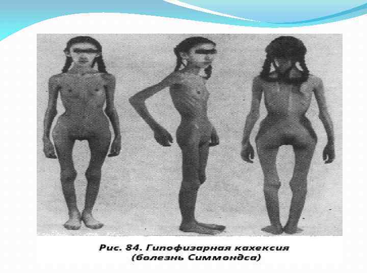 Болезнь Симмондса Гипоталамо-гипофизарная недостаточность, развивающийся в результате деструкции аденогипофиза с последующим стойким снижением продукции тропных гормонов и нарушением деятельности периферических эндокринных желез. 1) исчезновение подкожного жира (остаются «кожа да кости» ), резкое похудание; 2) старческий облик больного, не соответствующий возрасту; 3) кожа суха, атрофична, теряет свою эластичность; 4) выпадение волос всюду, даже бровей и ресниц; 5) выпадение зубов; 6) атрофия нижней челюсти.