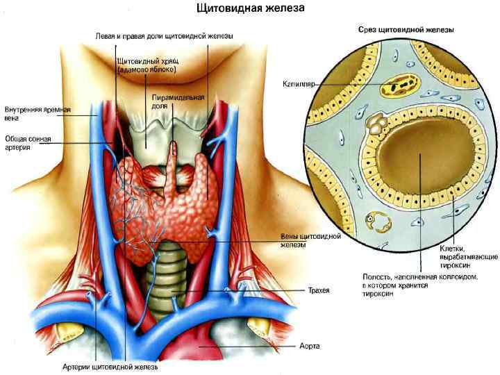 Щитовидная железа непарная, имеет форму галстука-бабочки. Располагается на уровне гортани и состоит из двух долей соединенных узким перешейком. У женщин она больше. Ее фолликулярные клетки синтезирует гормоны, содержащие йод: тироксин - (тетрайодтиронин) и трийодтиронин. Помимо фолликулярных клеток, в щитовидной железе есть клетки секретирующие гормон тиреокальцитонин, снижает содержание кальция в крови за счет угнетения остеокластов и стимуляции остеобластов. Является «кальций сберегающим гормоном»