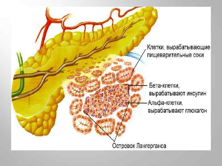 Поджелудочная железа со смешанной функцией. Вырабатывает поджелудочный сок и гормоны. Эндокринная часть поджелудочной железы представлена островками Лангерганса. Общая масса их - 1% массы поджелудочной железы. Островки состоят из эндокринных клеток разных видов, вырабатывающих инсулин и глюкагон. После удаления железы у собаки резко повышается глюкоза к крови, она появляется в моче, усиливается аппетит и жажда, потеря веса - сахарный диабет