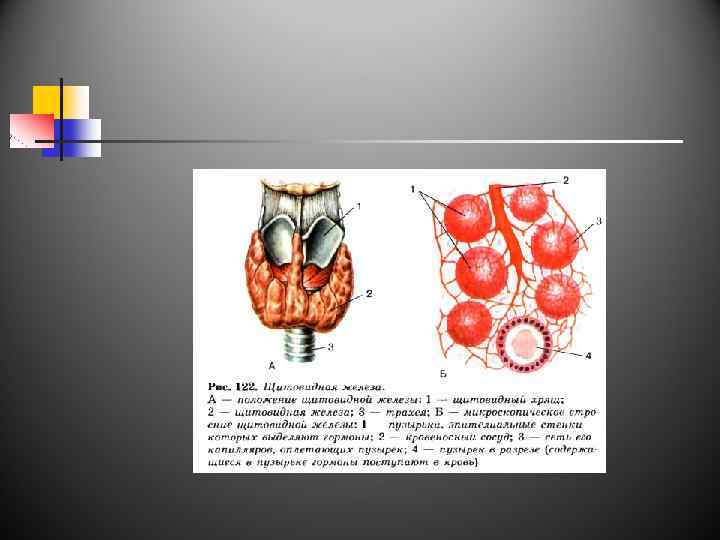 Щитовидная железа n n Расположена поверх щитовидного хряща. Строение: две доли, соединенные перемычкой и состоящие из пузырьков. Гормоны: тироксин, трийодтиронин Воздействие на организм : повышает возбудимость нервной системы и регулирует потребность кислорода.