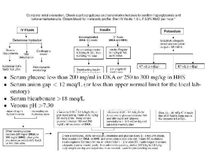 DKA da insülin tedavisinin kesilmesi? • Anyon GAP düzelirse, • p. H>7, 30 olursa, • Serum bikkarbonat>18 olursa, sc insüline geçilebilir. • S. c. İnsüline geçildikten yarım saat sonra iv insülin kesilir.