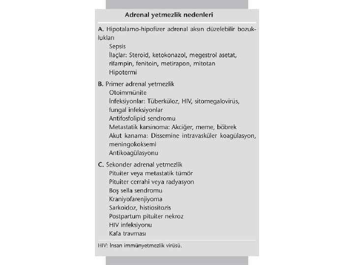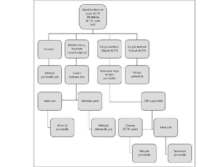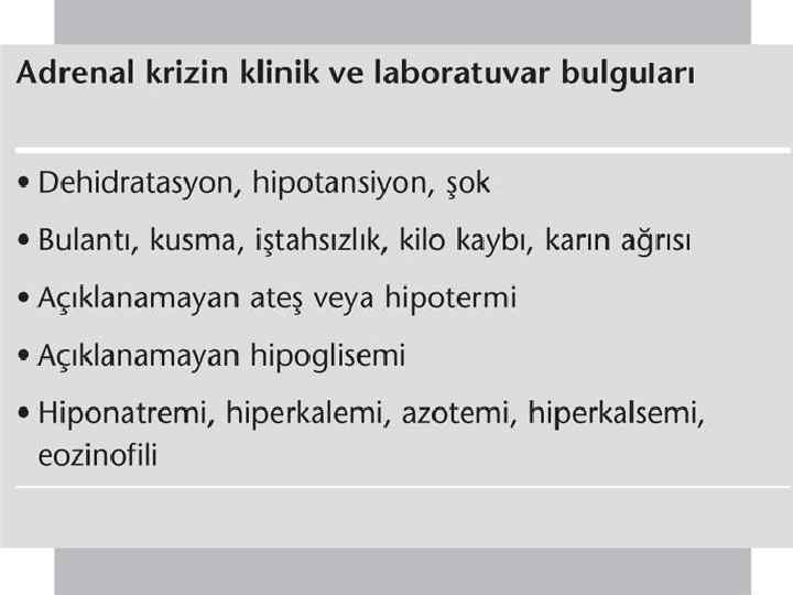 Tedavi • İntravasküler volümün restorasyonu (2 -3 L salin) • Sodyum açığının kapatılması • Glukokortikoid replasmanı • Altta yatan sebebin tedavisi