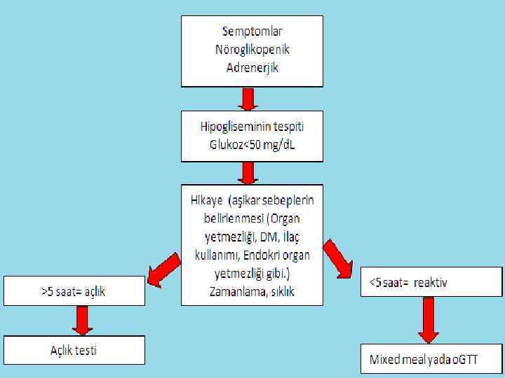 Tanı Hipogliseminin tespiti • Açlık hipoglisemisinin tespiti – Uzamış açlık testi • Post prandial hipogliseminin tespiti – Mixed-Meal testi – o. GTT