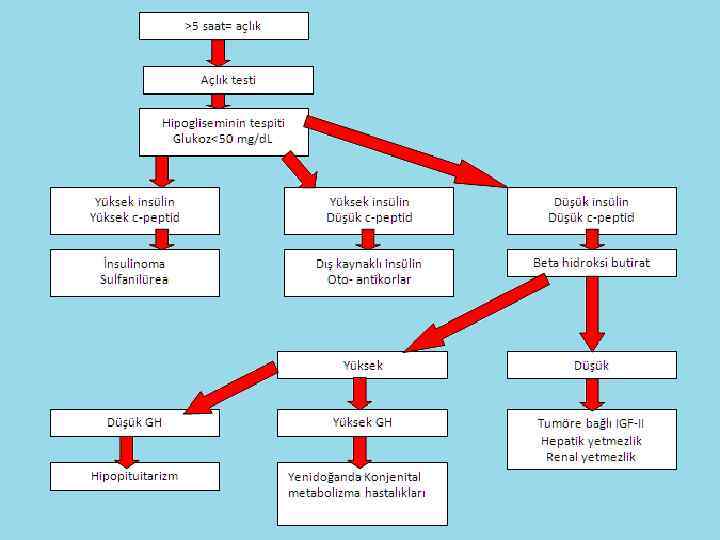 Sebebi Belirlemek • • Hikaye Biyokimyasal testler – – – – – Karaciğerfonksiyonları Renal fonksiyonlar Adrenal bez fonksiyonları Ön hipofiz fonksiyonları değerlendirilmelidir. Hipoglisemi anında alınan örneklerde kortizol ve büyüme hormonunun normal olması beklenmediktir. Hipoglisemik ajanlar açısından kan ve idrar örnekleri alınmalıdır. İnsülin ve insülin reseptör antikorları varlığı araştırılmalıdır. Hipoglisemi anında, insülin seviyesinin> 6 U/m. L olması hiperinsülinemik hipoglisemi tanısı koydurur. C-peptid seviyelerinin ölçülmesi sekonder amaçlı insülin uygulamaların doğrulamak amaçlı kullanışlıdır. IGF-II seviyeleri