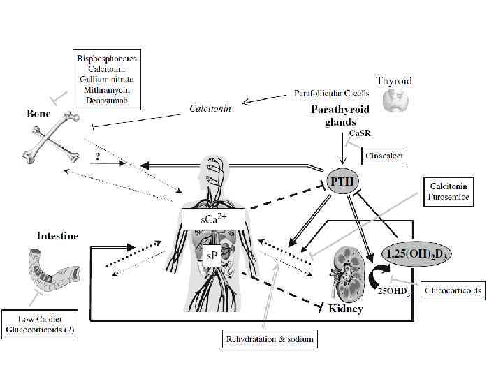• Vücutta kalsiyum, fosfat ve magnezyum dengesi üç hormon tarafından düzenlenir. Bunlar, parathormon ve kalsitonin ile bir sterol hormon olan 1, 25 dihidroksi D vitaminidir. • Aktif D vitamini etkilerini başlıca kemik ve barsak üzerinde gösterir. Barsaktan kalsiyum emilimini artırır. Kemik üzerine etkisi PTH ile benzerdir. • PTH, kemik, böbrek ve dolaylı olarak (D vitamini üzerinden) barsaklar üzerindeki etkisiyle kalsiyumu artırır. • Kalsitonin kemik yıkımını azaltıcı, renal kalsiyum ve fosfor ıtrahını artırıcı etkisi vardır. Etkisi kalsiyum azaltıcı yöndedir.