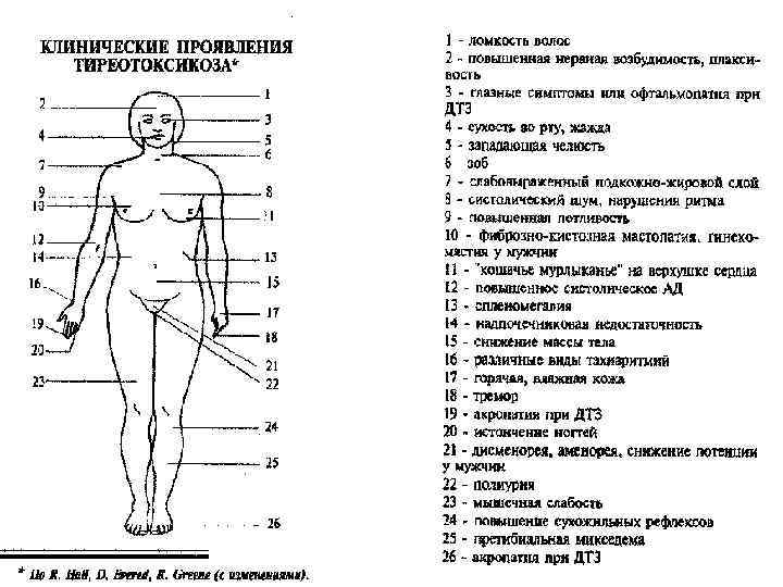 Тиреотоксикоз Синдром поражения сердечнососудистой системы (тахикардия, гипертензия); l Глазные симптомы (симметричное пучеглазие); l Синдром поражения центральной и периферической нервной системы (тремор, возбудимость, потливость, стойкий красный дермографизм, повышение сухожильных рефлексов); l Синдром катаболических нарушений (похудание, субфебрилитет). l