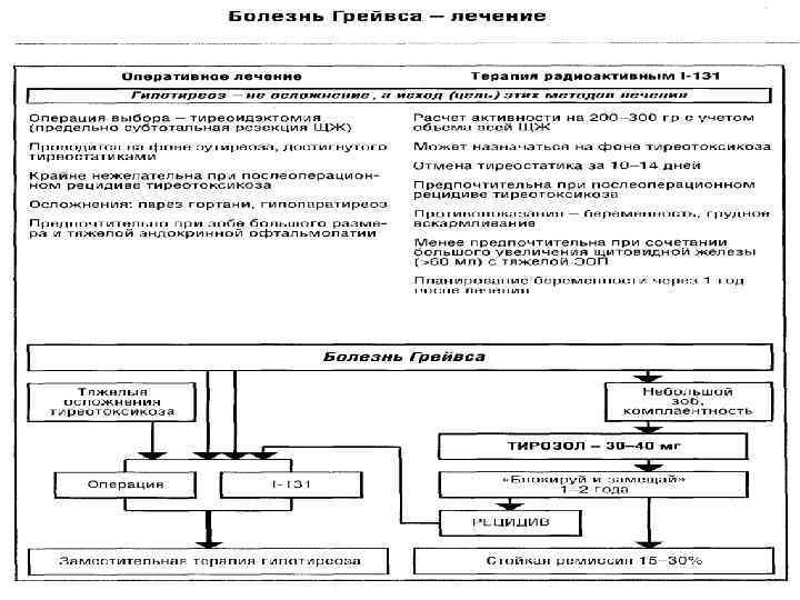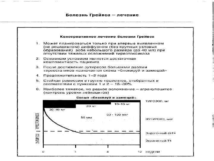Течение и прогноз l Без лечения заболевание прогрессирует вплоть до развития тиреотоксического криза, фибрилляции предсердий и СН, токсического поражения печени. l При своевременном начале лечения прогноз для больных легкой и средней тяжести благоприятный, все изменения обратимы. l При тяжелом течении органические изменения необратимы. l Сложен прогноз при офтальмопатии, которая может прогрессировать при эутиреозе и приводить к потере зрения.