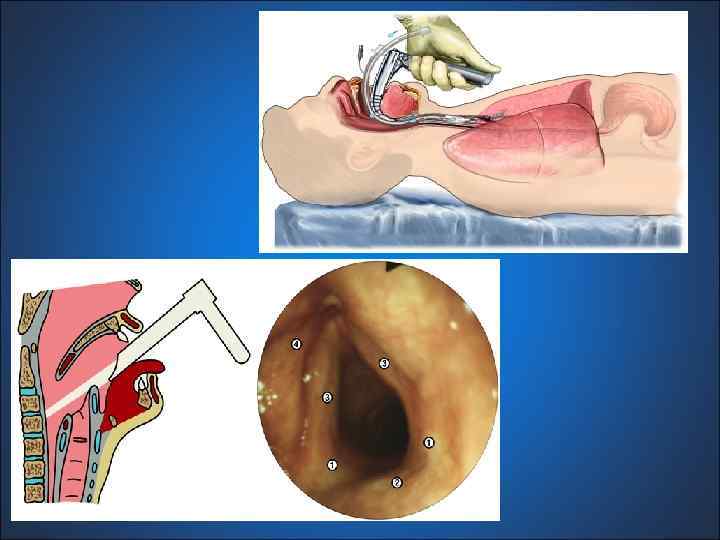 5. Осторожно продвигая клинок ларингоскопа вперед по средней линии, осмотреть рот больного, язычок, глотку и надгортанник, одновременно поместив правую руку на лоб больного или на затылок, поддерживая его голову в запрокинутом положении; 6. Поднять надгортанник , подхватив край его клинком прямого ларингоскопа или отдавливая основание надгортанника кривым клинком. Осмотреть черпаловидные хрящи и вход в гортань и в заключении голосовые связки;