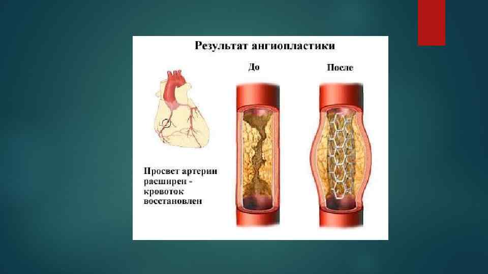 Осложнения чрескожных коронарных вмешательств Серьезные осложнения встречаются редко и чаще всего наблюдаются в случае поступления пациентов в остром периоде инфаркта миокарда, в тяжелом состоянии с кардиогенным шоком, с множественным поражением коронарных сосудов и значительными изменениями в мышце сердца, тяжелым атеросклерозом периферических артерий. После ангиопластики в период между третьим и шестым месяцами может произойти повторное сужение сосуда в том же месте — рестеноз. Рестеноз считается не осложнением ангиопластики, а скорее ответом сосудистой стенки на эндоваскулярное вмешательство.