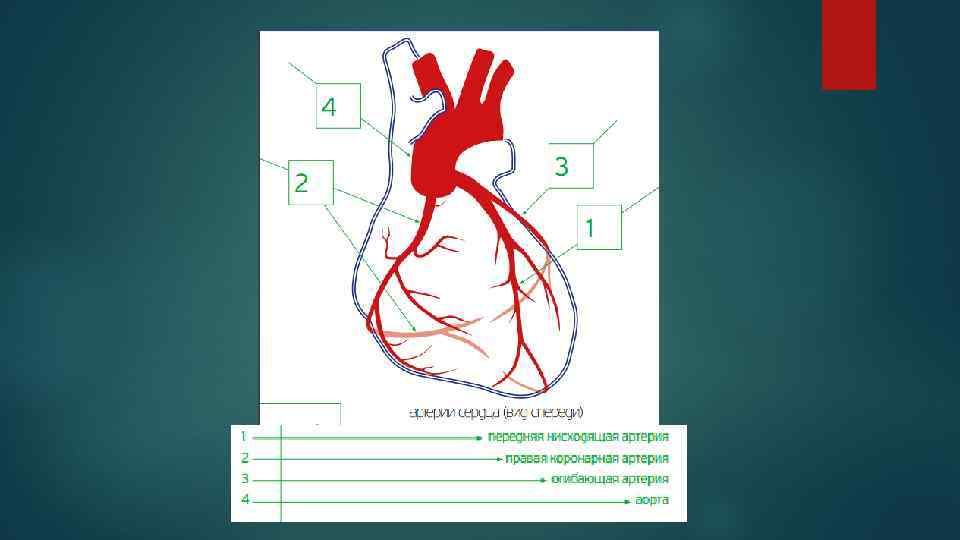 Кровоснабжение Ø Правая коронарная: -правый желудочек Ø § -легочный ствол -синоатриальный узел -нижнюю стенку левого желудочка -задний отдел межжелудочковой перегородки -атриовентрикулярный узел Левая коронарная: Передняя нисходящая артерия: -передняя стенка -передний отдел межжелудочковой перегородки -верхушка и часть боковой стенки левого желудочка § Огибающая артерия: -задняя и боковая стенки левого желудочка -левое предсердие