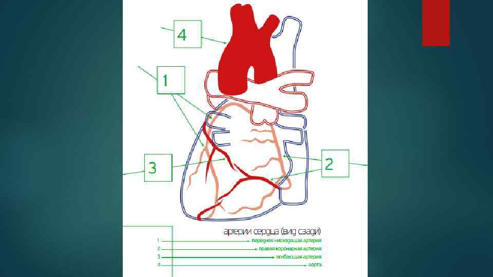 Типы кровоснабжения Правый тип: встречается в 70 % случаев. Задняя нисходящая артерия отходит от правой коронарной артерии. Левый тип: около 20 %. Задняя нисходящая артерия отходит от огибающей артерии. Смешанный тип: 10 %. Участие принимают и правая и левая коронарные артерии.