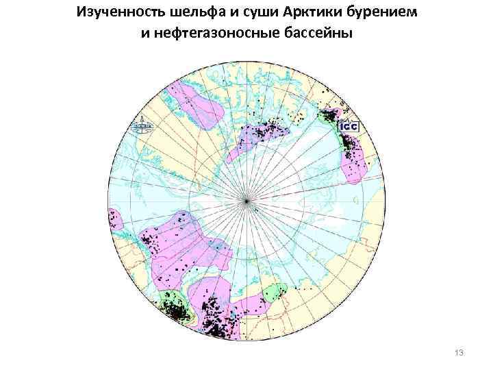 Изученность шельфа и суши Арктики бурением и нефтегазоносные бассейны 13