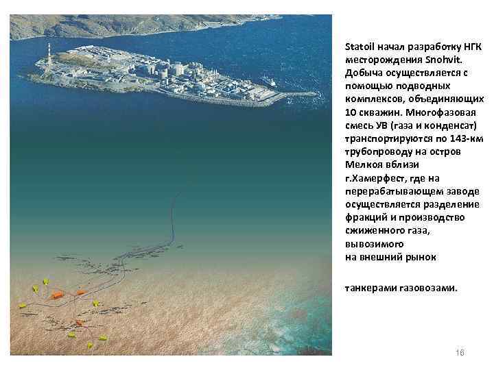 Statoil начал разработку НГК месторождения Snohvit. Добыча осуществляется с помощью подводных комплексов, объединяющих 10 скважин. Многофазовая смесь УВ (газа и конденсат) транспортируются по 143 -км трубопроводу на остров Мелкоя вблизи г. Хамерфест, где на перерабатывающем заводе осуществляется разделение фракций и производство сжиженного газа, вывозимого на внешний рынок танкерами газовозами. 16