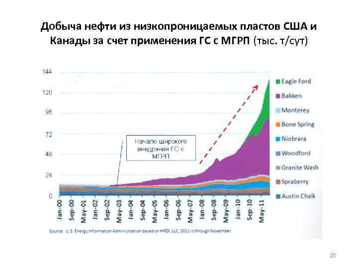 Добыча нефти из низкопроницаемых пластов США и Канады за счет применения ГС с МГРП (тыс. т/сут) 21