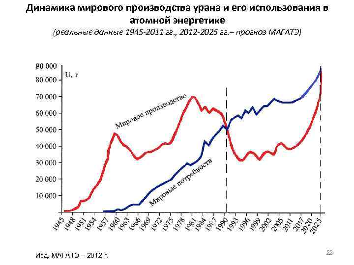 Динамика мирового производства урана и его использования в атомной энергетике (реальные данные 1945 -2011 гг. , 2012 -2025 гг. – прогноз МАГАТЭ) Изд. МАГАТЭ – 2012 г. 22