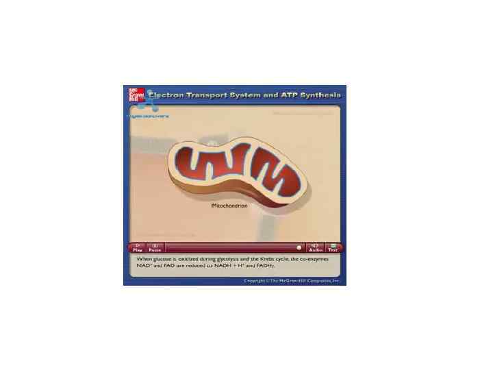Кислородное окисление - дыхание Когда разность потенциалов на внешней и внутренней стороне внутренней мембраны достигает 200 м. В, протоны (24 Н+) проходят через канал фермента АТФсинтетазы и происходит восстановление кислорода до воды (12 Н 2 О) с выделением энергии, часть которой запасается в форме 34 АТФ. Таким образом, в митохондрии образуется всего 36 АТФ – 55%, 45% - рассеивается в форме тепла.