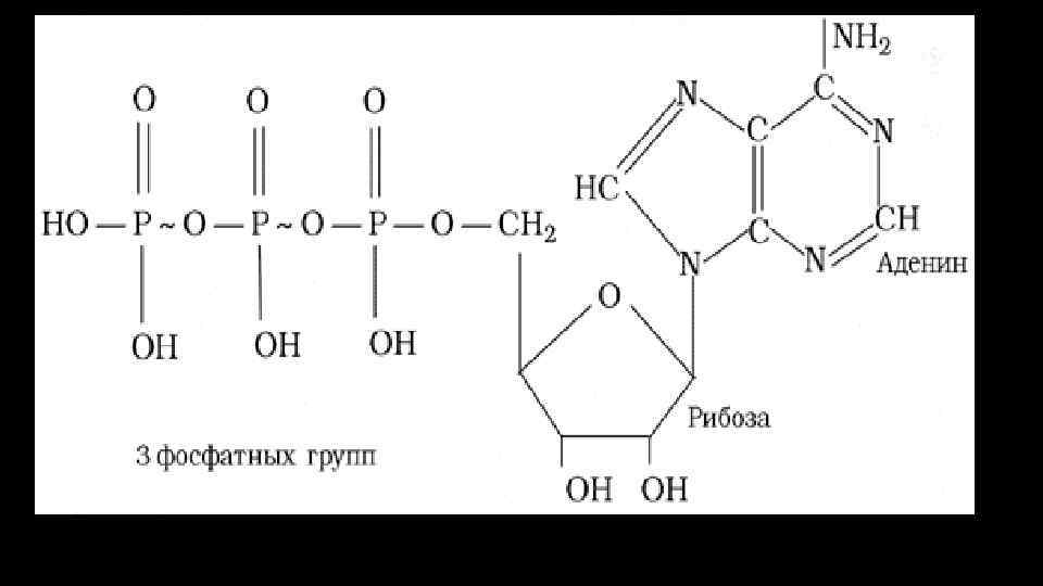 2. Структура АТФ и ее роль в энергетическом обмене • Почему именно молекула АТФ является основным поставщиком химической энергии для биохимических процессов? • Молекула АТФ построена из: • - азотистого основания – аденина; • - моносахарида – рибозы; • - трех остатков фосфорной кислоты. Азо тистые основа ния — гетероциклические органические соединения, входящие в состав нуклеиновых кислот. АТФ представляет собой формулу: Аденин – рибоза – фосфат ~ фосфат.