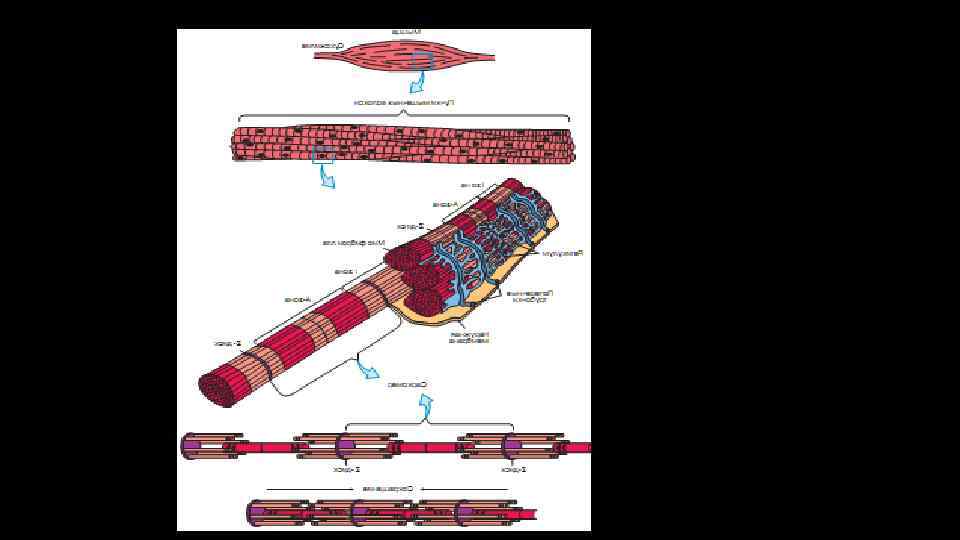 • Каждая поперечно-полосатая мышца состоит из нескольких тысяч волокон, объединенных прослойками из соединительной ткани и такой же оболочкой – фасцией. • Мышечные волокна (или мышечные клетки - миоциты) представляют собой сильно вытянутые многоядерные клетки: длина их достигает от 0, 1 до 2 -3 см, а в некоторых мышцах – более 10 см. Толщина мышечных клеток 0, 1 -0, 2 мм; • Мышечные волокна объединены в пучки.