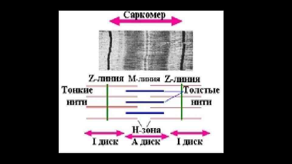 • В середине пучка тонких нитей поперечно располагается тонкая пластинка из белка, которая фиксирует положение мышечных нитей в пространстве. Она называется Z-линией. • Участок миофибриллы между соседними Z-линиями называется саркомером. • Длина саркомера достигает 2 -2, 5 мкм. Каждая миофибрилла состоит из нескольких тысяч саркомеров. • Саркомер - структурно-функциональная единица мышечной ткани; • Толстые и тонкие нити состоят только из белков: актина и миозина;