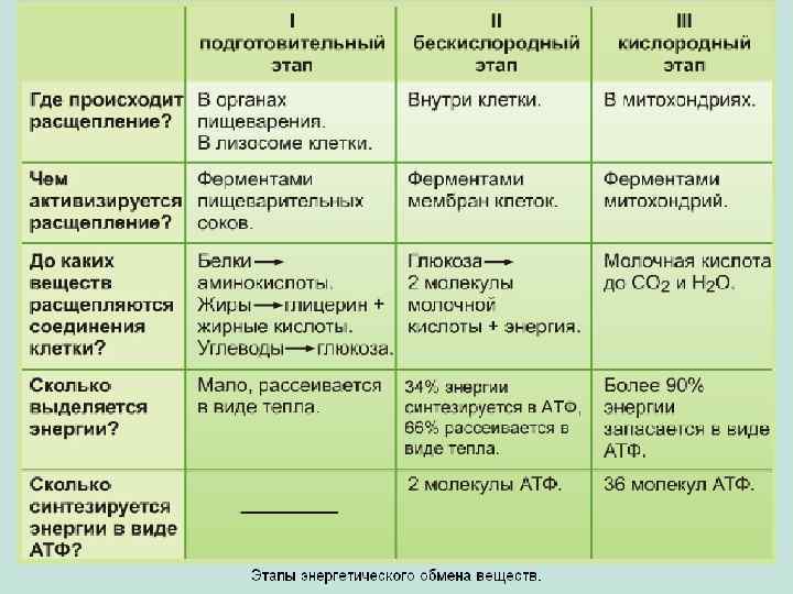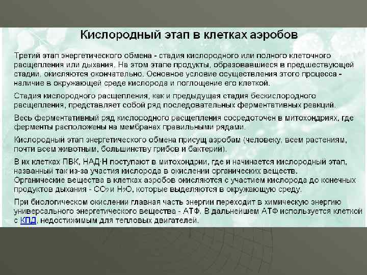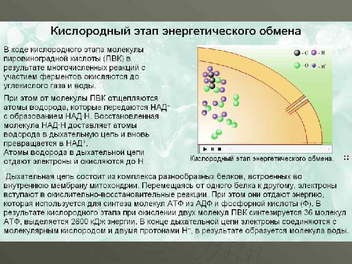 Этапы энергетического обмена 1 -й этап Подготовительный 2 -й этап Бескислородный, анаэробное дыхание Распад крупных Расщепление полимеров на мономеров под мономеры, воздействием происходит в клеточных ЖКТ под ферментов и с воздействием использованием пищеварительны АТФ. Происходит х ферментов и в цитоплазме. желудочного Запасается сока. Малое около 40% выделение энергии 3 -й этап Кислородный, аэробное дыхание Расщепление пировиноградно й кислоты в митохондриях. Запасается около 65 -70 % энергии